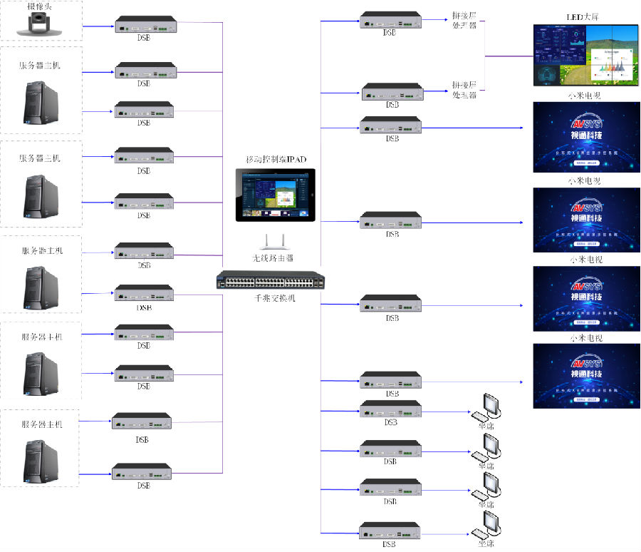 2、分布式中控、音频、视频一体化可视化应用,部署方便、使用灵活、维护简单。
