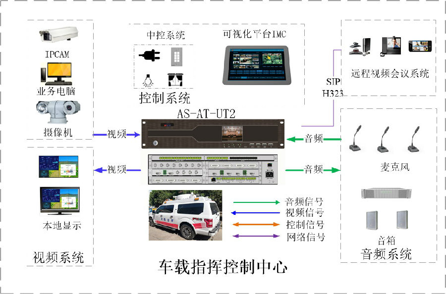 通信车的设计和建设,要按照先进、可靠、长远发展的要求进行,适应数字化、网络化、系统化、多维化发展的需要。车载音视频综合一体机AS-UT2系统以机动指挥车新一代标准设计,符合国家标准,集音视频处理器、视频切换、可编程中控、车载行程录播、音视频指挥调度等业务模块,通过可视化人机操作界面,实现高效率机动指挥调度,解决动中通应急指挥应用。