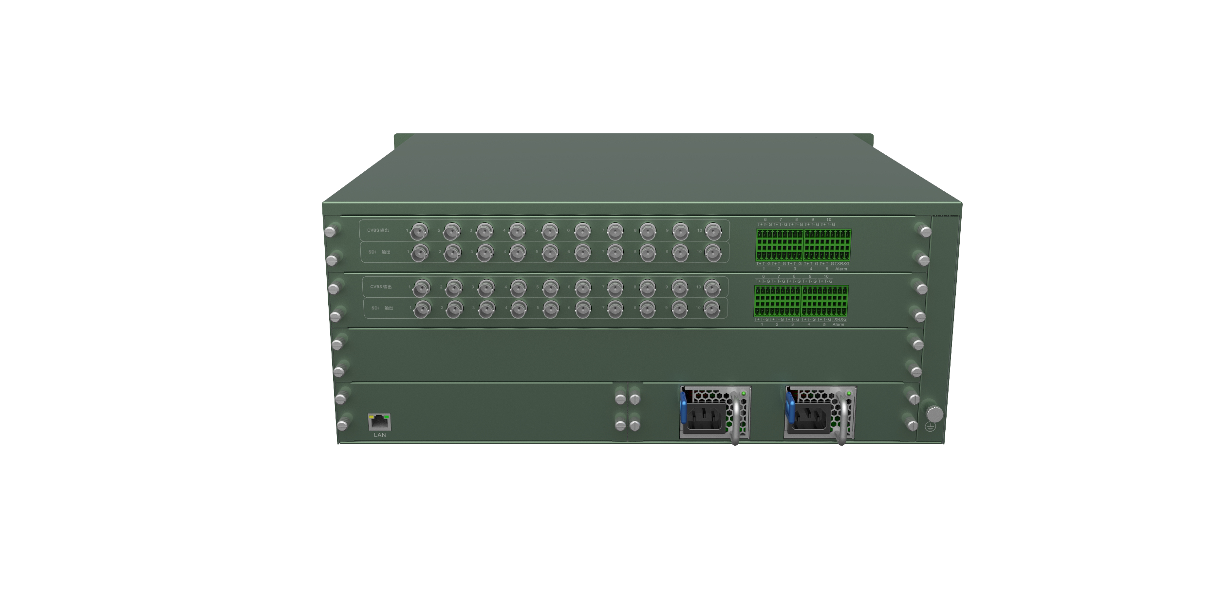 编码刀片,10路3G-SDI和CVBS输入,主子双码流;10路RS485控制接口,1路RS232报警接口。